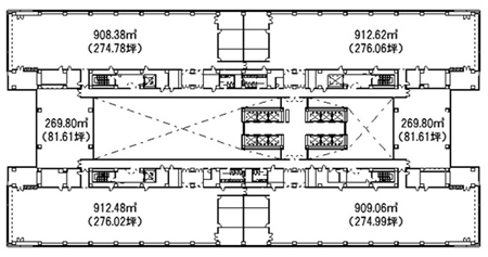 [平面図]1フロア1,200坪超の大型ビルですが、幅広いニーズ(25坪より分割可能)にお応えしていますので、ぜひ一度ご相談下さい。